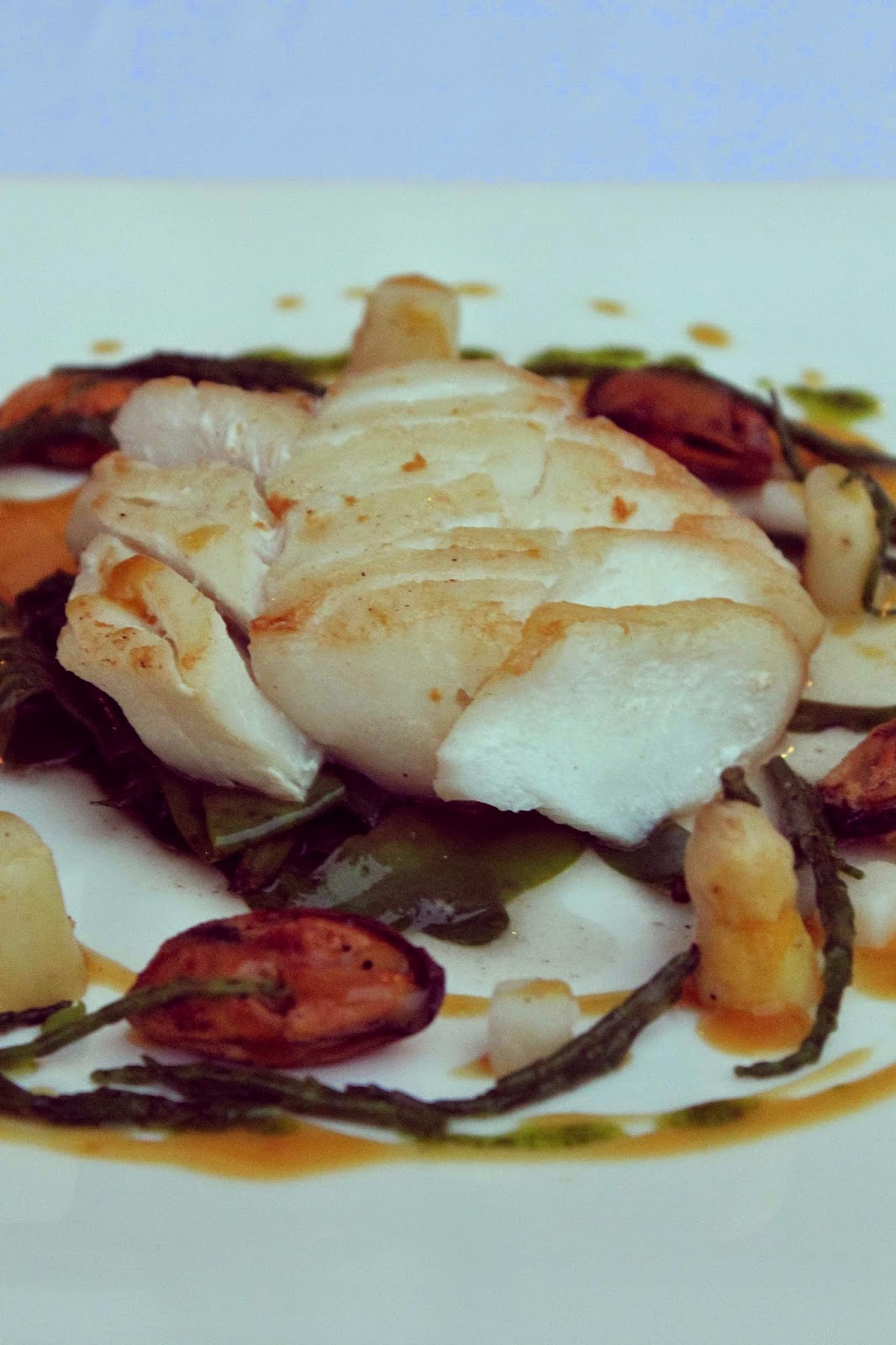 Cod, sea lavender, curry sauce, asparagus tops, steamed mussels samphire